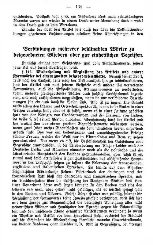 Gemäß seiner Kraft, teils nach der Einheit, teils nach der Bestimmtheit hin zu individualisieren, sind der Artikel und nach seinem Beispiele auch andere ihn vertretende Formwörter, auch die Präpositionen, strenggenommen zu wiederholen, wenn mehrere gleich geordnete Wörter auch sachlich Verschiedenes bezeichnen, und noch entschiedener wegzulassen, wenn sie nur verschiedene Bezeichnungen für ein und dasselbe Wesen sind. Also ist zu sagen: Die Schuld trifft allein den Pfarrer und Ortsschulinpektor N., wenn beide Ämter in einer Person vereinigt sind; aber es ist falsch, wenn es in einer Zeitung geheißen hat: von der Königin von Großbritannien und der Kaiserin von Indien, da beide Titel einer Person anhaften. Ebensowenig darf der Artikel und die Präposition vor einem zweiten Eigenschaftsworte wiederholt werden, wenn zwei (oder mehr) Eigenschaften als dem nämlichen Wesen anhaftend gedach sind: das war ein bedeutsamer und ausschlaggebender Erfolg; schöne Frauen, welche die Welt nur in Himmelblau und Rosa zu sehen gewohnt sind. Nur wenn es gilt, die Verschiedenheit der Individuen oder Gegensätze auszudrücken, ist die Wiederholung am Platze: Leider muß der Deutsche Berlin und München einander noch als die politische und die künstlerische Hauptstadt des Reiches gegenüberstellen, aber falsch ist es, zumal nach solch artikellosen Eigenschaftswörtern das abschließende Hauptwort in der Mehrzahl folgen zu lassen: die Erlernung der französischen, englischen und italienischen Sprachen. So könnte auf dem Schuster-Régnierschen Wörterbuche stehen: Wörterbuch der deutschen und der französischen statt bloß der deutschen und französischen Sprache, und ein Berichterstatter über die Eröffnung der Rovignoer Station des Berliner Aquariums hätte auch sagen können: In den Becken und (in) den Gläsern sah man, aber gewiß nicht gefälliger, als er wirklich gesagt hat: in den Becken und Gläsern. Solche Kürze ist aber nur zulässig, solange die Weglassung der Formwörter keine Zweideutigkeit verschuldet, weil sich hier mit dem Hange zur Bequemlichkeit die berechtigte Abneigung aller nicht pedantischen Bildner und Handhaber der Sprache gegen die Schwerfälligkeit und den unschönen Klang gehäufter Artikelformen verbindet; ja wenn ein Adjektiv und Artikel vor dem Hauptwort steht, verbietet die Rücksicht auf die Schönheit die Wiederholung förmlich: manche Gewerbtreibende, ein kleiner Schlosser oder Tischler z. B. Nur in Gegensätzen, bei strenger $Seite 135$ Zweiteilung, wie sie z. B. nicht-nur, sondern-auch, sowohl-als auch ausdrücken, auch nach zwischen, überhaupt wenn es wichtig ist, die Verschiedenheit zu betonen, empfiehlt sich die Wiederholung. So hätte ein Germanist lieber schreiben sollen: man unterscheide zwischen der harten und der weichen (statt und weichen) Spirans; ebenso hätte in dem folgenden Satze der Täglichen Rundschau das eingeklammerte (die) nicht fehlen sollen: über die verschiedene Art und Weise, wie die Garnison und [die] bürgerliche Bevölkerung von Belfort von der hoffnungslosen Lage Kenntnis erhielten. Gewissenhaft schreibt Koser: Er hat geduldig gewartet, ehe er zwischen den dickköpfigsten (den Engländern) und den ehrgeizigsten Leuten von Europa (den Franzosen) seine Wahl traf; ebenso Langbehn in „Rembrandt als Erzieher": Wie es dieselbe Geisteskraft ist, wenn auch in verschiedener Anwendung, welche aus Goethe und aus Bismarck spricht, so ist es auch ein und dieselbe, wenn auch verschieden angewandte Geisteskraft, welche aus Schiller und welche aus Rembrandt spricht. Dagegen wird durch die Worte Jensens: durch den Luneviller Frieden und Reichsdeputationshauptschluß (statt: und den Reichsdeputationshauptschluß) der Geschichtsunkundige wieder verleitet, beide für eins zu halten.