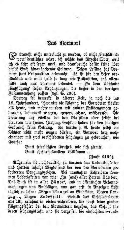 Es braucht nicht untersucht zu werden, ob nicht ,Verhältniswort' deutlicher wäre; ich wähle das kürzeste Wort, weil ich es sehr oft setzen muß, und beanspruche dafür keine über dieses Buch hinausgehende Geltung. Schon Lessing hat Vorwort statt Präposition gebraucht. Es ist für den Leser verständlich und nicht halb so lang wie Präposition, das allenfalls auch nur Vorwort bedeutet. — In dem Abschnitt ,Satzfügung' stehen Ergänzungen, die besser in den dortigen Zusammenhang passen (vgl. S. 296). Vorweg sei bemerkt: in älterer Zeit, ja noch bis ins 19. Jahrhundert, schwankte die Fügung der Vorwörter stärker als heute, und mehre wurden mit andern Fallbeugungen gebraucht, besonders wegen, gegen, ohne, während. Die Berufung auf Stellen bei den Klassikern oder selbst bei Neueren wie Heine, Freytag, Gutzkow haben für den heutigen Gebrauch keine Geltung. So würde z. B. heute selbst ein Dichter nicht mehr wagen dürfen, ein Vorwort kurz nacheinander mit zwei verschiedenen Fügungen zu gebrauchen, wie Goethe: Statt feierlichsten Grußes, wie sich ziemte, Statt ehrfurchtsvollem Willkomm .. (Faust 9192). Allgemein ist nachdrücklich zu warnen vor Undeutlichkeiten und Härten infolge Weglassens der von den Vorwörtern geforderten Beugungszeichen. Bei namhaften Schreibern kommen Loddrigkeiten vor wie: ,In (aus) aller Herren Länder, Das Buch ist in aller Hände' , und in öffentlichen Bekanntmachungen und Anschlägen, nun gar erst in Anzeigen steht täglich zu lesen: ,Wegen Mangel an Bindfäden, Wegen Umzug .., Wegen Todesfall' . Sobald das Geschlechtswort ausfällt, erlahmt in vielen Schreibern, die sonst keine groben Fügungsfehler bei den Vorwörtern begehen, das Gefühl für deren Fügungskraft, und sie vergessen die einfachsten Grund- $Seite 171$ regeln, die sie noch jetzt in früh auswendig gelernten Verschen hersagen könnten. Wo nach Vorwörtern die Beugung des Hauptwortes ohne Geschlechtswort nicht deutlich zu erkennen ist, muß auf andre Weise für das sofortige Erkennen der richtigen Fügung gesorgt werden. Man darf bedenkenlos schreiben: ,Er fehlte wegen Krankheit' , weil diese Einzahlform für jedes Vorwort dieselbe ist; aber ,wegen Reichtümer' wird von Gebildeten störend empfunden, weil die Beugungslosigkeit leicht als eine Folge sprachlicher Unwissenheit gilt. Wo der Zweitfall stehen muß, will ihn das gebildete Ohr auch hören. ,Wegen Reichtümer, wegen Mißverständnisse, während Fieberzustände' ist nicht gradezu falsch, aber das Sprachgefühl sträubt sich aus einem sehr löblichen Grunde dagegen. Darum, nur darum, ist auch die nach dem Buchstaben der Beugungslehre nicht falsche Verbindung ,Verein Berliner Studenten' unzulässig, weil das Gefüge nicht ohne weiteres erkennbar hervortritt. Vielfach wird aus richtigem Gefühl für die Härte zu dem nicht unbedenklichen Mittel gegriffen, durch einen falschen Fall mit deutlicher Fallendung eine festere Fügung zu schaffen, also z. B. während, das sonst nur mit dem Zweitfalle steht, mit dem Drittfall zu verbinden: ,während zehn Tagen' . Zu empfehlen ist dieses Heilmittel eines Notstandes nicht, denn bei der heutigen Verbreitung strengerer Sprachausbildung könnte es nicht so sehr als Notbehelf wie als Unwissenheit gedeutet werden. Ich bediene mich in solchen Fällen andrer Ausdrucksmittel, deren wir im Deutschen nicht ermangeln, etwa: ,zehn Tage lang (hindurch)' . Wie steht es in den nicht seltnen Fällen, wo man, besonders um der Kürze und Bündigkeit willen, zwei Vorwörter nebeneinander braucht, die verschiedene Beugungsfälle fordern? ,Mit und ohne Geld, Um und bei dem Hause, Ich lebe für und mit dir, Durch und wegen des Geldes' — sind solche Verbindungen zulässig? Die strenge Sprachlehre sagt Nein, aber sie läßt sich erweichen für solche Fälle, wo die Gleichheit der Hauptwortform die Verschiedenheit der Vorwortfügung verschleiert, wo also kein unterscheidendes Geschlechtswort den Fehler schonungslos aufdeckt. ,Mit und ohne Geld, vor und für Gott, von und für England' sind erträglich, ja bedenkenlos zulässig; ,um und bei dem Hause, für und mit dir, mit und ohne dich, durch und wegen des $Seite 172$ Geldes, während und nach dem Gewitter, Er lebt in und durch die Hoffnung' sind für sprachgebildete Ohren unmöglich, und kein Notstand entschuldigt dergleichen, denn es gibt mehr als eine fehlerfreie Hilfe aus solcher vermeintlichen Not. |